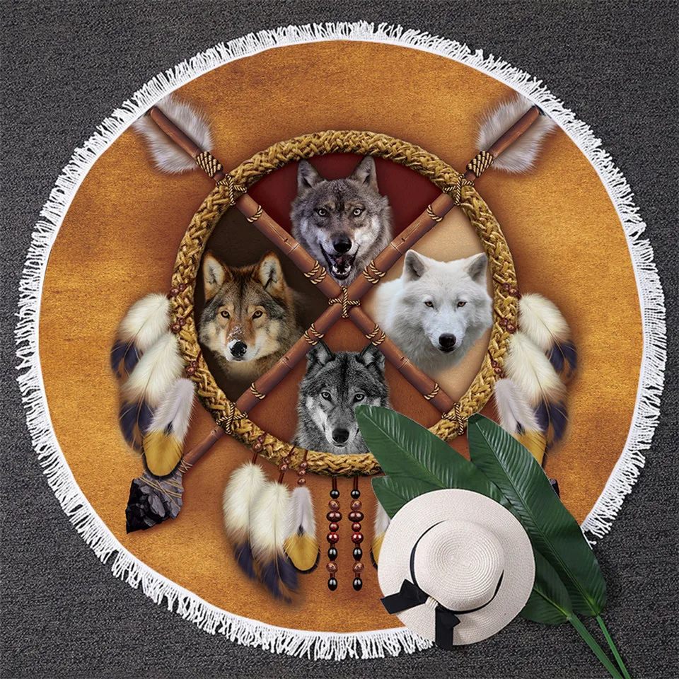 Günstige Kaufen BlessLiving Wölfe Dreamcatcher Runde Strand Handtuch für Frau, Indische Wolf Kreis Bad Handtuch Tier Decke Picknick Matte Quaste 150 cm Preise Online.