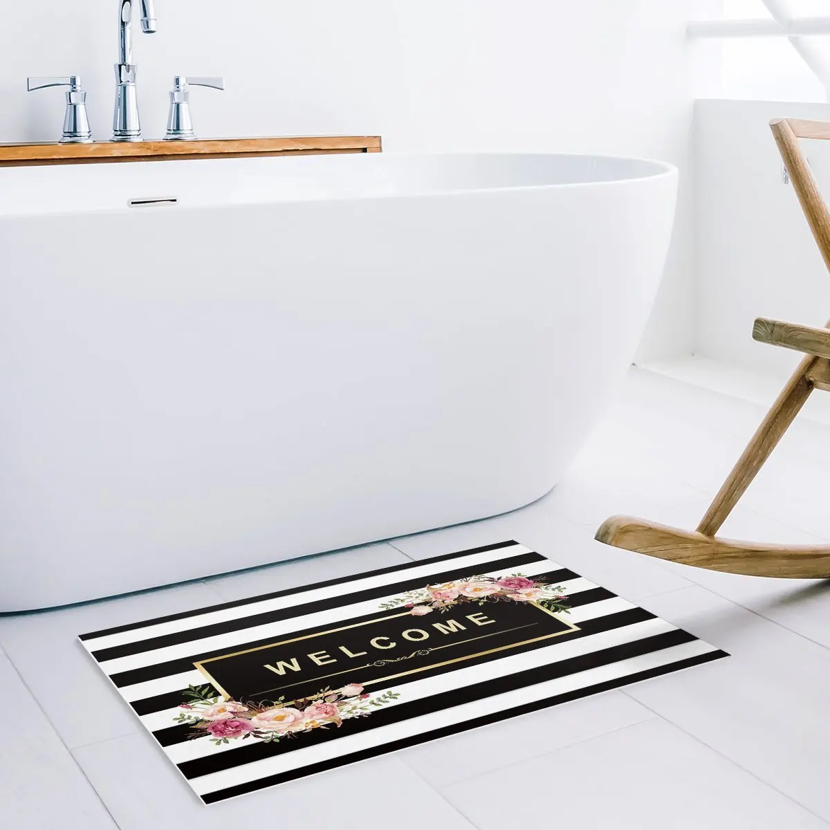Billige Kaufen Schwarz Und Weiß Streifen Floral Willkommen Tür Matten Küche Boden Bad Eingangsbereich Teppich Matte Saugfähigen Innen Bad 32x20 zoll Preise Online