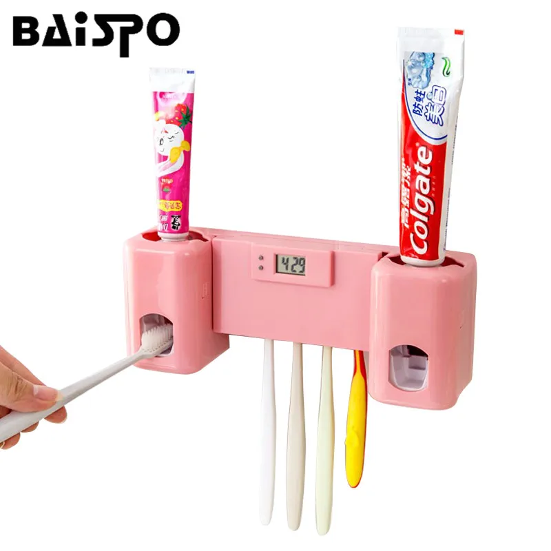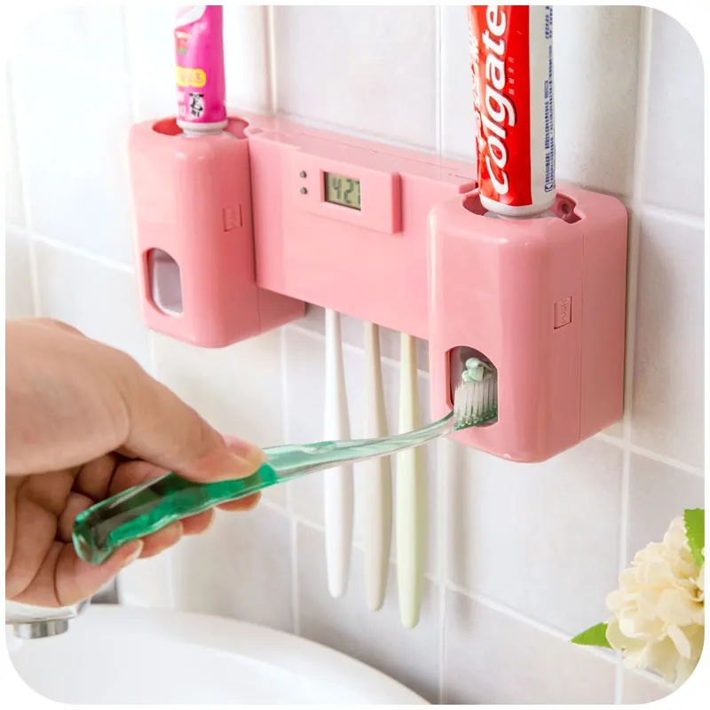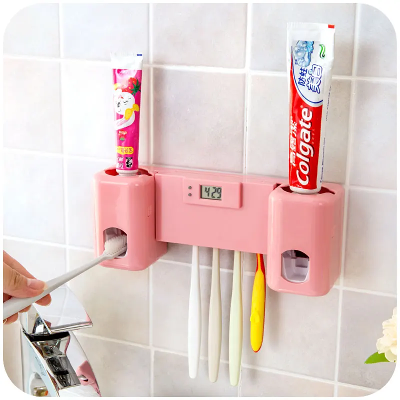 Kaufen Günstig Badezimmer zubehör Produkte Uhr Automatische Zahnpasta Spender Zahnbürste Halter Set Wand Halterung Rack Zahnpasta Orangenpressen Preise Online